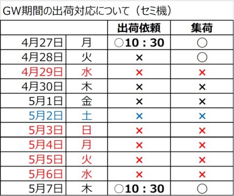 GW期間中は、パーツおよびセミ機の出荷対応日が通常と異なります。期間中は運送会社の取扱量増加および縮小運行により、配送遅延が発生する可能性がございます。